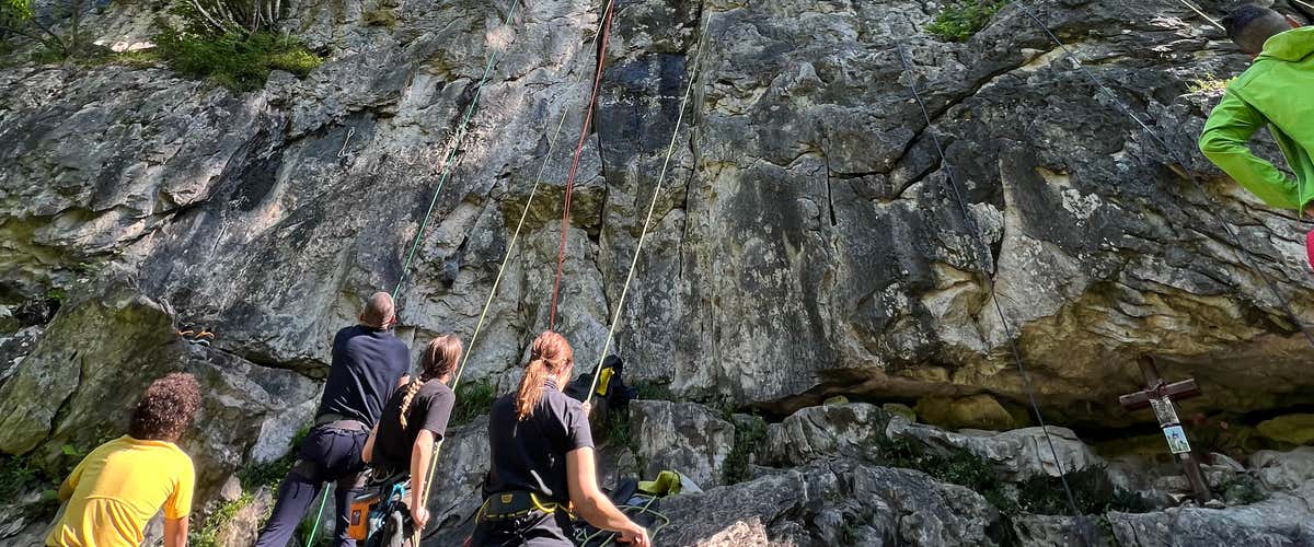 E in men che non si dica, inizieremo ad arrampicare! L'esperienza si svolge in cordata, ovvero in piccoli gruppi di 3 persone che si alterneranno tra arrampicata e sicura; questo significa che mentre una persona arrampica, un'altra persona verrà istruita per garantirne la sicurezza a terra. Ogni partecipante potrà arrampicare circa 4 volte in modalità top-rope, salendo e scendendo dalla parete verticale che misura da 10 a 20 metri d'altezza; per il resto del tempo vestirà il ruolo di sicura o di osservatore. La guida alpina e l'istruttore di arrampicata saranno sempre presenti, pronti a impartire indicazioni e consigli.