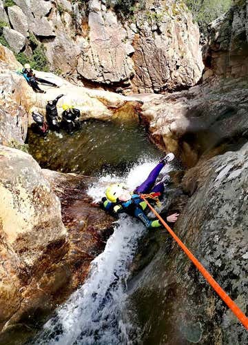 Il percorso inizia con una calata di 6 metri e continua lungo il letto del fiume tra cascate e divertenti scivoli rocciosi, i cosiddetti toboga. Scaleremo le pareti rocciose con l'ausilio della corda e salteremo da rocce alte fino a 7 metri per tuffarci nelle acque pure e cristalline di questo torrente dell'entroterra sardo.