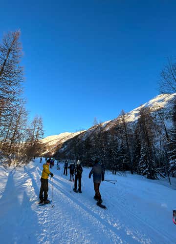 Ad accoglierci ci sarà la nostra guida, pronta ad condurci tra i paesaggi innevati della Valle d'Aosta. Indossate le ciaspole e impugnati i bastoncini, inizieremo la nostra avventura tra i boschi della Val Ferret, non prima di aver preso confidenza con i nostri strumenti in un briefing di circa 10 minuti.