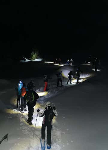 Ed eccoci pronti per dare inizio alla nostra ciaspolata sotto le stelle! Cammineremo nello splendido paesaggio innevato della Val di Fassa, lungo un percorso illuminato dalle nostre torce frontali nonché dalla luna riflessa sui cristalli di neve.