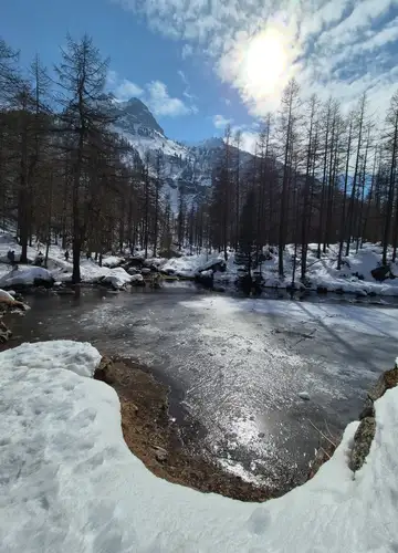 Ciaspole ai piedi, entreremo subito nel vivo dell’escursione, imboccando il sentiero nella Val di Rhêmes che ci porterà all'incantevole Lago Pellaud, la cui superficie in inverno è ghiacciata.