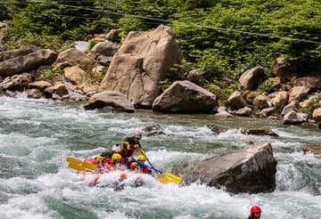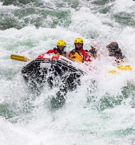 Pagaierai a bordo di un gommone affrontando un percorso di 7 km dove le rapide di acqua verde smeraldo si alternano ai placidi laghetti, tra gole a strapiombo e rocce affioranti dal fiume che diventano veri e propri trampolini naturali.