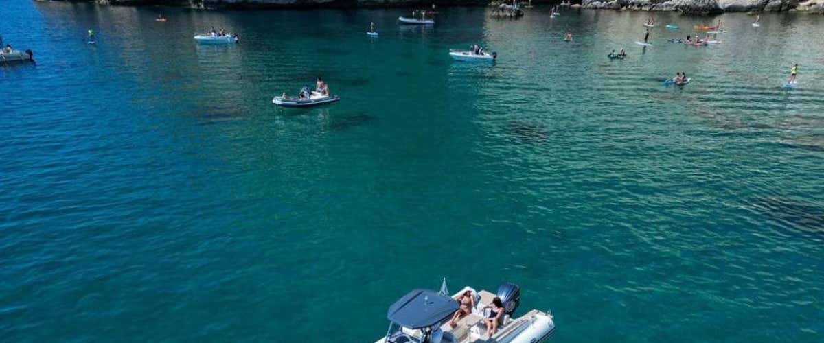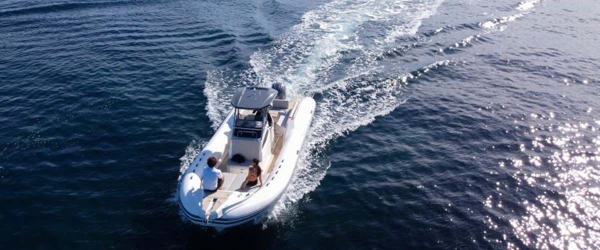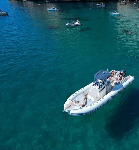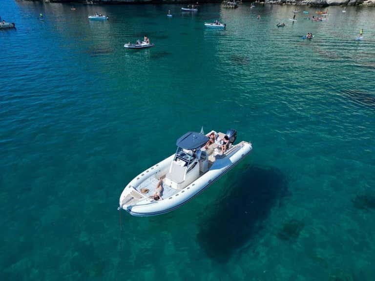 L'imbarcazione utilizzata è un gommone Capelli Tempest da 10 metri, con prendisole, scaletta di risalita, doccetta d’acqua dolce e tendalino. A bordo si sta scalzi.