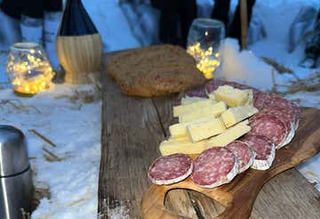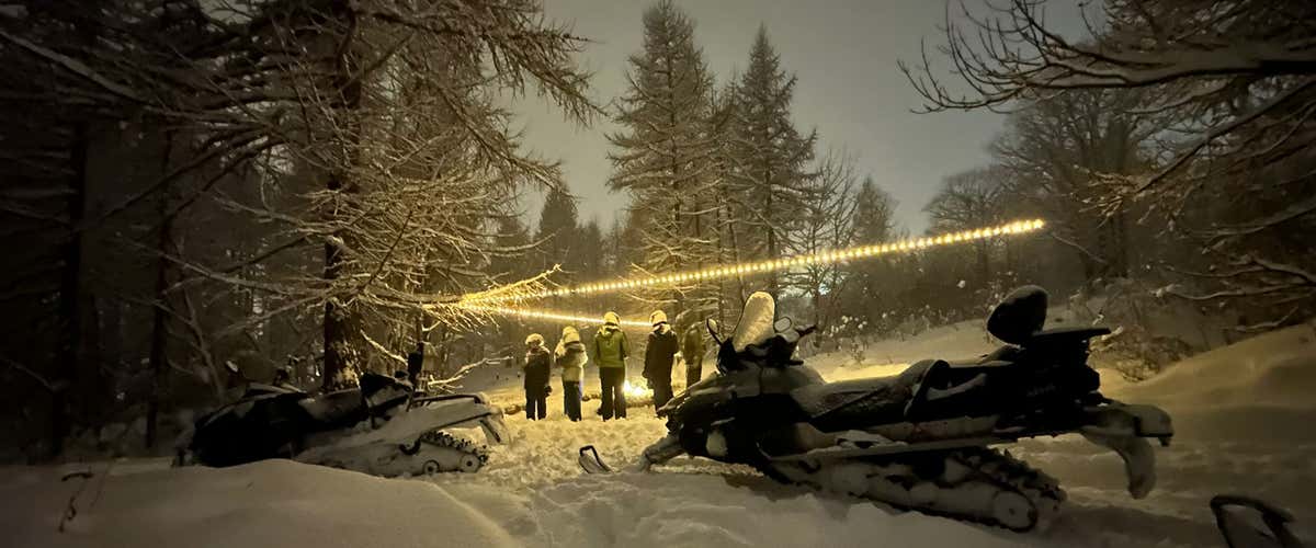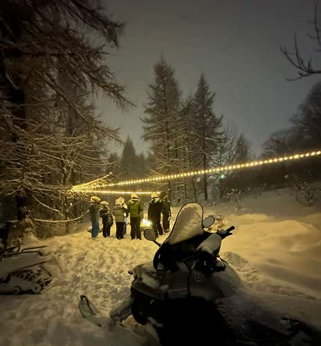 A due passi da Sestriere, nella Val Troncea, ti aspetta un'esperienza che mescola avventura e magia: 1 ora di tour in motoslitta tra paesaggi innevati e poi un aperitivo nel bosco con taglieri di salumi e formaggi piemontesi, pane di montagna e vino rosso servito tra fiocchi di neve e lucine.