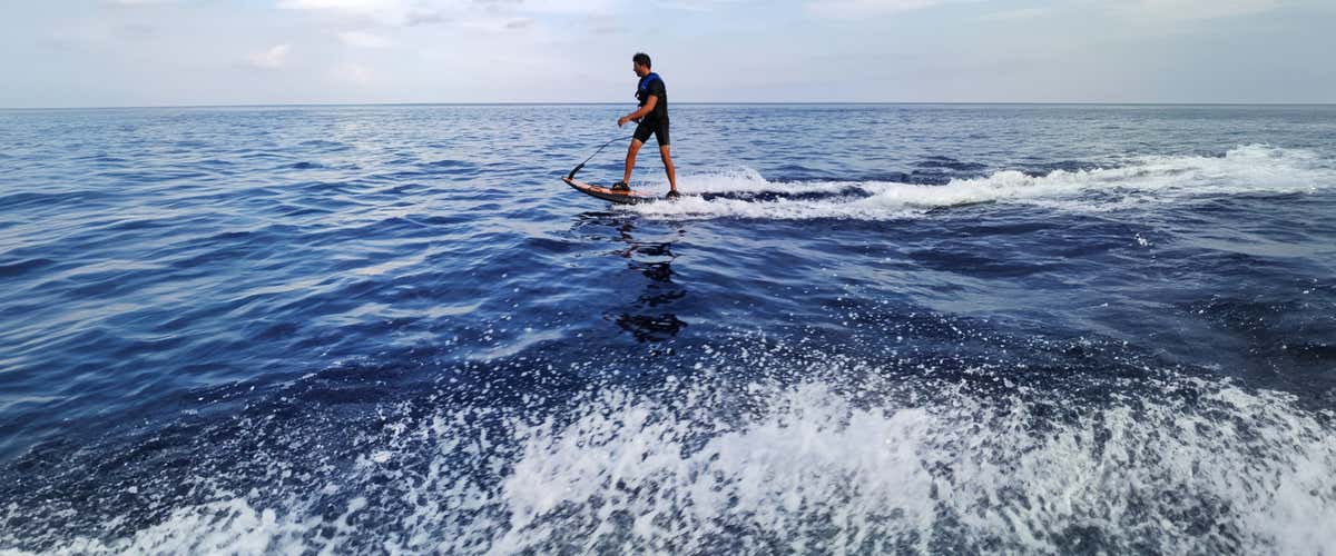 Grazie a una tavola motorizzata, permette di volare in piedi sull'acqua a gran velocità e senza bisogno di onde. E il bello è che, a differenza di una moto d'acqua, non serve la patente nautica per usare la tavola, grazie alla sua leggerezza e semplicità di utilizzo.