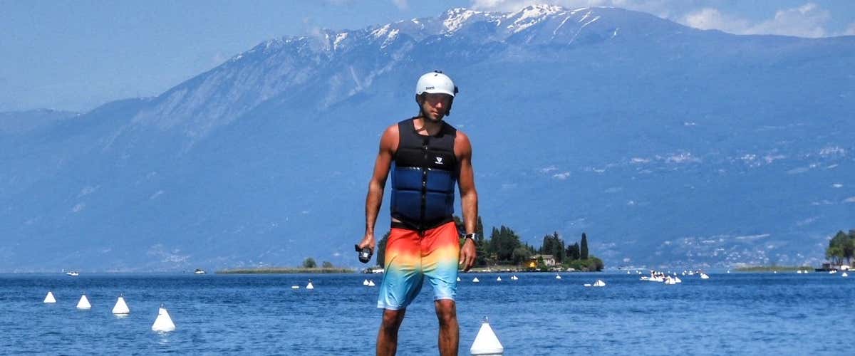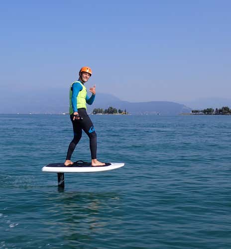 Sarà allora che ti avventurerai nelle (o meglio, sulle) acque del Lago di Garda: grazie agli insegnamenti e consigli dell'istruttore che ti seguirà a bordo di una moto d'acqua, e con il quale comunicherai via radio, imparerai ben presto a usare l'e-foil e a "volare sull'acqua" con l'Isola del Garda e l'Isola di San Biagio sullo sfondo.