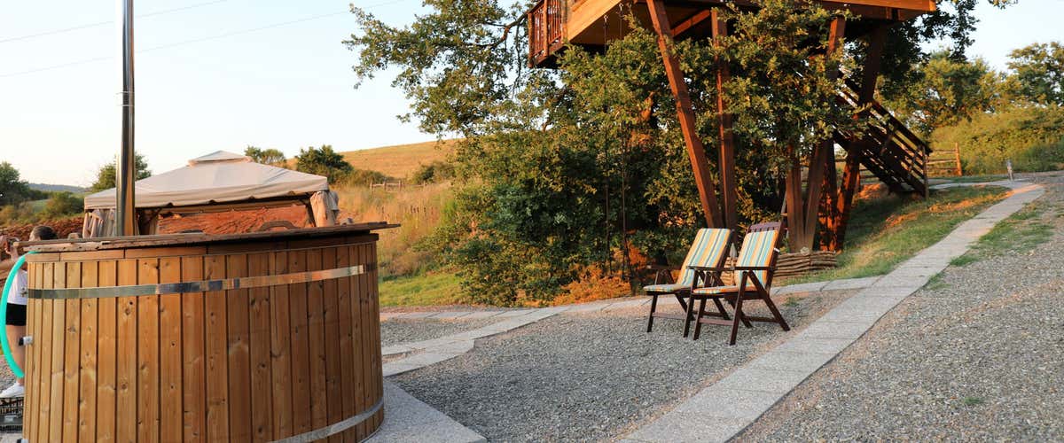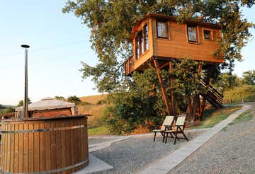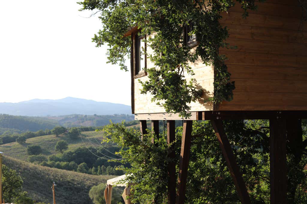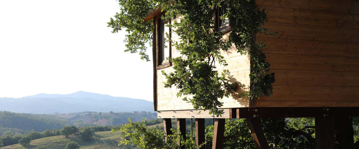 Tra le colline della Maremma Toscana e le fronde di una grande quercia, ti aspetta una vera casa sull'albero a 8 metri da terra, da cui ammirare spettacolari tramonti e il cielo stellato.