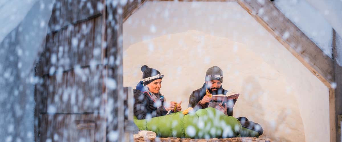 Dopo cena potrete concederci un momento di puro relax nella sauna e nelle vasche idromassaggio all'aperto, circondati da neve e stelle. E quando sarete pronti per la notte, vi sistemerete nel vostro Igloo romantico: un rifugio intimo e accogliente, con letti di pelle di pecora e sacchi a pelo termici che garantiscono un riposo caldo e confortevole; il bagno dista 100 metri dall'alloggio e non è dotato di doccia.