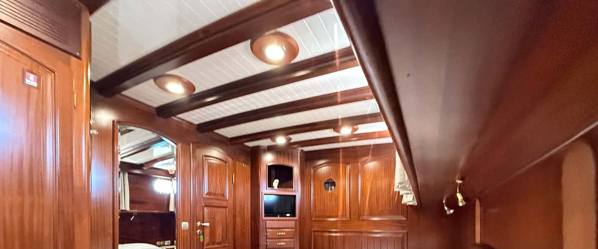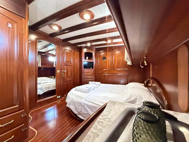 Potrai scegliere tra due tipologie di cabine: matrimoniale standard e una suite armatoriale con scrivania, tutte con bagno privato completo di box doccia, lavabo e wc elettrico, TV, Wi-Fi e prese 220V. A bordo troverai anche acqua e kit cortesia.