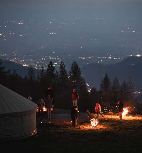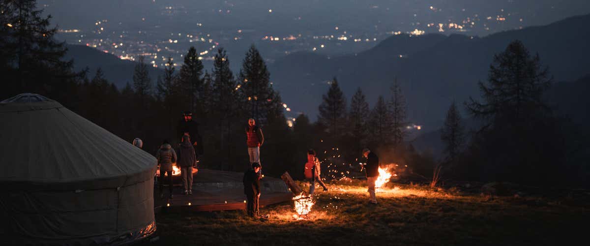 La serata avrà al centro il grande braciere panoramico del rifugio, posto a 1500 metri d'altezza in Val Chisone, tra alpeggi e boschi di larici. Seduti intorno al falò, gusterete un buffet di antipasti misti, seguito dal tipico Fujot, un piatto unico servito in terracotta a base di carne e verdure, cucinato sul fuoco. La cena si concluderà intorno alle 21:30 con il dolce della casa, ma potrete rimanere per quanto vorrete davanti al falò, chiacchierando e godendovi la notte di montagna.