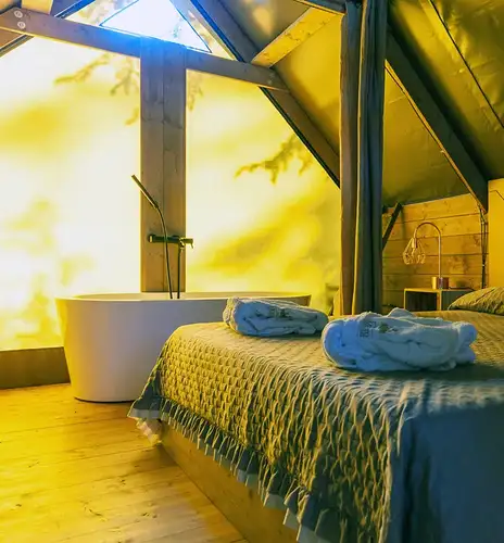 Ogni Glam Tent dispone di bagno interno privato con vasca/tinozza, lavabo, wc e bidet. Sono inclusi biancheria, asciugamani, asciugacapelli e dispenser di sapone. Le tende sono inoltre dotate di climatizzatore per raffrescare o riscaldare l'alloggio.