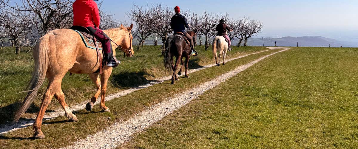 Ed eccoci pronti per dare inizio alla nostra passeggiata a cavallo: dopo un breve tratto su asfalto, imboccheremo un sentiero nel bosco e continueremo a cavalcare in una cornice naturale tra campagna e pascolo. Ci avventureremo lungo un percorso panoramico con vista sul territorio della Lessinia, il Monte Baldo, il Monte Cornetto e altre montagne; il panorama può estendersi fino alla città di Verona e gli Appennini! La guida conduce generalmente la passeggiata a cavallo.