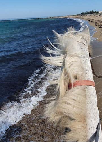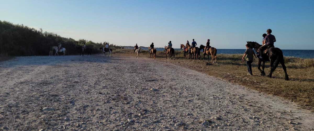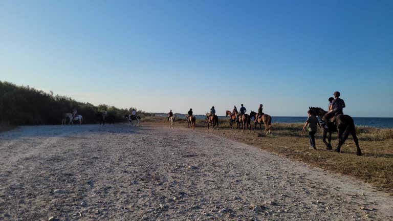 Cavalcheremo al passo fino alla Marina di San Cataldo, dove scenderemo sul bagnasciuga o sulle dune (a seconda del periodo dell'anno) per un tratto di passeggiata vista mare davvero spettacolare. Torneremo poi al maneggio attraversando di nuovo la riserva naturale.