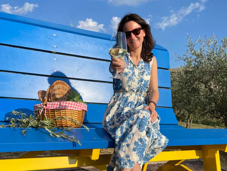 Infine, riceveremo il telo da picnic e il cesto da picnic (ogni 2 adulti) e ci accomoderemo nel cuore dell'oliveto secolare. Qui si trova una colorata panchina gigante, sulla quale potremo scattare una simpatica foto ricordo e all'ombra della quale potremo brindare in occasione del nostro picnic. Quest'ultimo prevede salumi di cinta senese, formaggi, confetture, crostini e pane; in accompagnamento, 1 bottiglia di vino DOC Trasimeno a scelta tra Rile e Oscano.