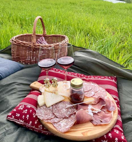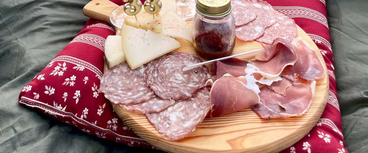 - Cestino Degustazione: Cestino con tagliere di salumi e formaggi locali + pane caldo; acqua inclusa; telo e cuscini forniti. Questa opzione non prevede vino.