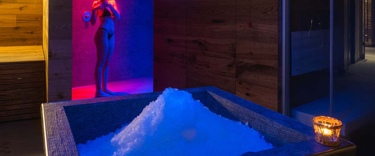 Dopo l'accoglienza, ci recheremo nello spogliatoio per cambiarci. Potremo dunque accedere alla spa che si compone all'esterno di jacuzzi e sauna ad infrarossi; all'interno di sauna, bagno turco, docce emozionali, cascata di ghiaccio e una scenografica tinozza finlandese con cielo stellato artificiale. È inoltre presente una zona relax con tisane a disposizione.