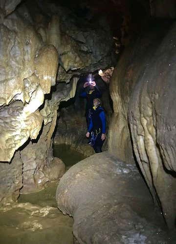 Saremo circondati da spettacolari pareti di stalattiti e stalagmiti e, seguendo il rumore dell'acqua, giungeremo fino a splendide cascate sotterranee che attraverseremo con facilità grazie all'ausilio di una corda.