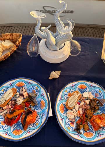 - Assapora un aperitivo a bordo con calice di prosecco e ottime specialità cilentane a base di pesce e verdure