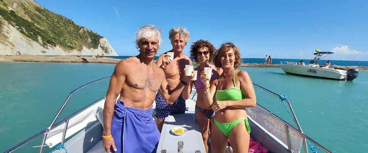 Una volta terminato l'imbarco di tutti i passeggeri a bordo della barca a motore aperta, saremo pronti per salpare all'ombra del Monte Conero. Navigheremo al largo delle principali attrazioni della zona quali la Spiaggia delle Due Sorelle e la Spiaggia dei Gabbiani, splendida cornice naturale dove avrà luogo una prima sosta bagno.