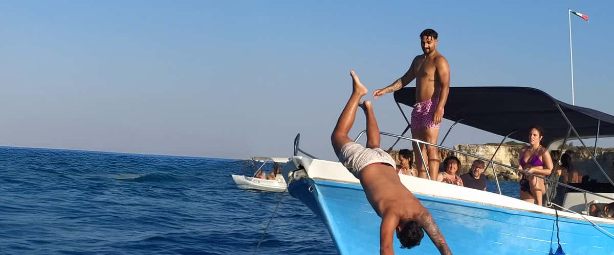 Ad accoglierci ci sarà lo skipper che ci accompagnerà in questa esperienza. Dopo la formazione del gruppo, raggiungeremo insieme la nostra imbarcazione (gozzo o gommone, a seconda del numero dei partecipanti) e inizieremo la navigazione lungo la costa del Salento.