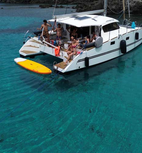 L'imbarcazione è un catamarano lungo 10 metri e largo 5,30, dotato di rete a prua per rilassarsi, cuscineria a poppa, servizi igienici, doccetta di acqua dolce e scaletta di risalita.