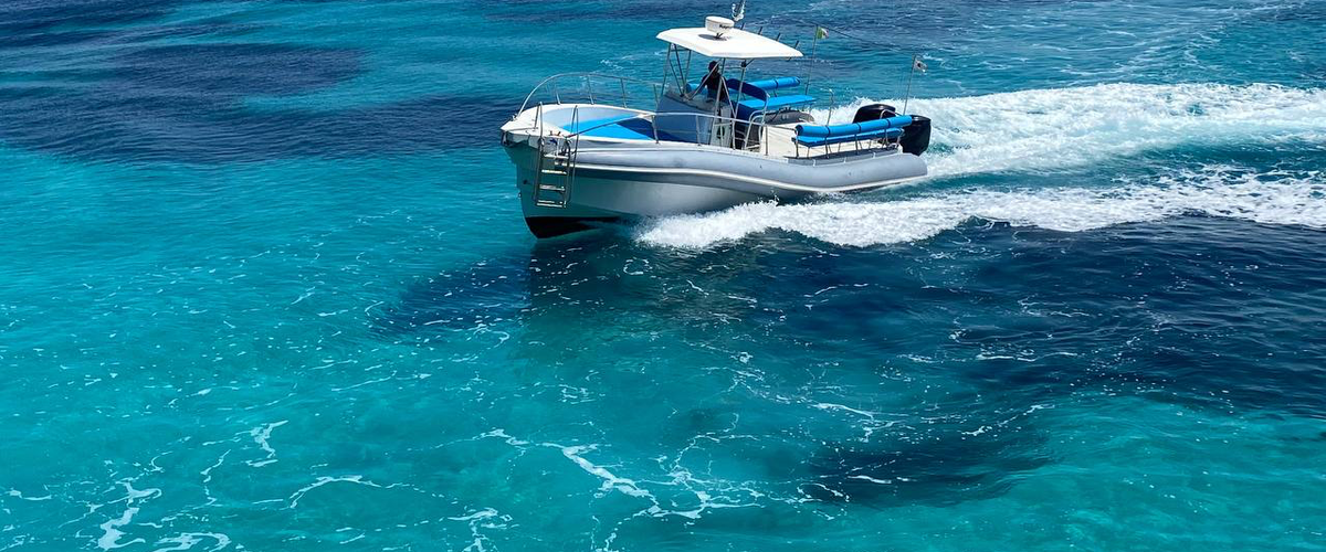 L'ultramoderno gommone Scanner, lungo 10 metri e motorizzato Suzuki con due motori da 300 HP, è dotato di tutti i comfort: comode sedute centrali per ammirare le coste e i colori degli arcipelaghi, ampio prendisole a prua, plancetta con scaletta per la risalita dall'acqua, impianto doccia con acqua dolce, frigo, stereo e tendalino fisso rigido per ripararsi dal sole.