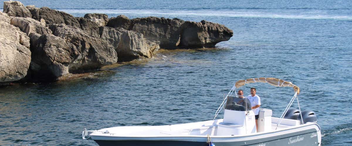 L'imbarcazione a disposizione per il tour è una moderna barca Sunshine, larga 3,05 metri e lunga 9 metri. È dotata di 2 motori Yamaha da 150 cv. A bordo è presente il WC, il frigobar, cuscineria, tendalino e dispositivi di sicurezza.
