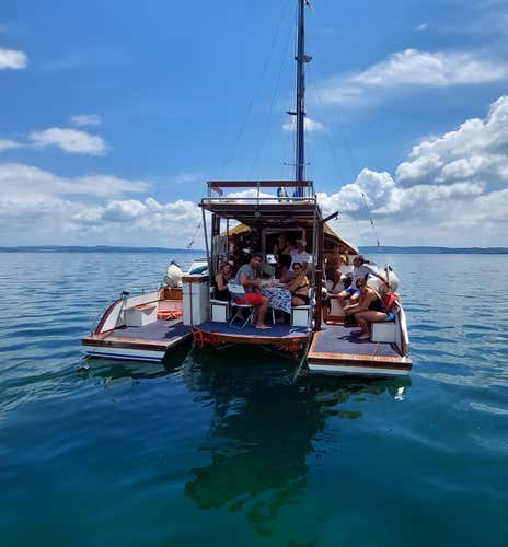 Terminato l'imbarco dei passeggeri, avrà luogo una breve introduzione durante la quale decideremo l'itinerario di navigazione della giornata così da soddisfare i desideri di tutti. Durante la navigazione, che avrà durata generalmente 2 ore in base alla destinazione scelta dal gruppo, potremo metterci comodi sulle reti della barca.