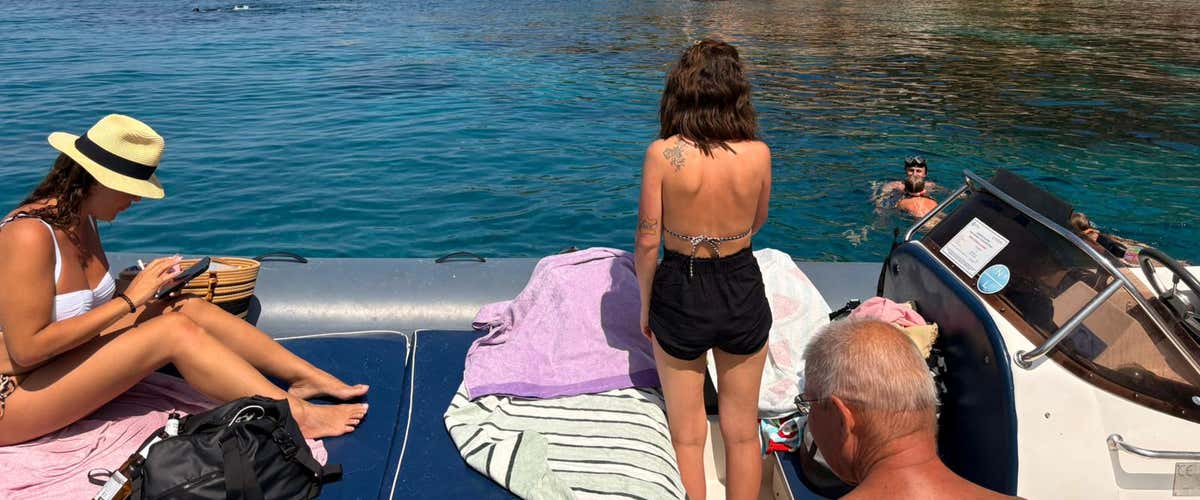 Il gommone utilizzato durante l'attività ha una lunghezza di 8 m, un motore da 250 CV e una capienza massima di 12 persone. Si tratta di un'imbarcazione spaziosa, dotata di sedute comode, prendisole, scaletta di risalita e doccetta d'acqua dolce.