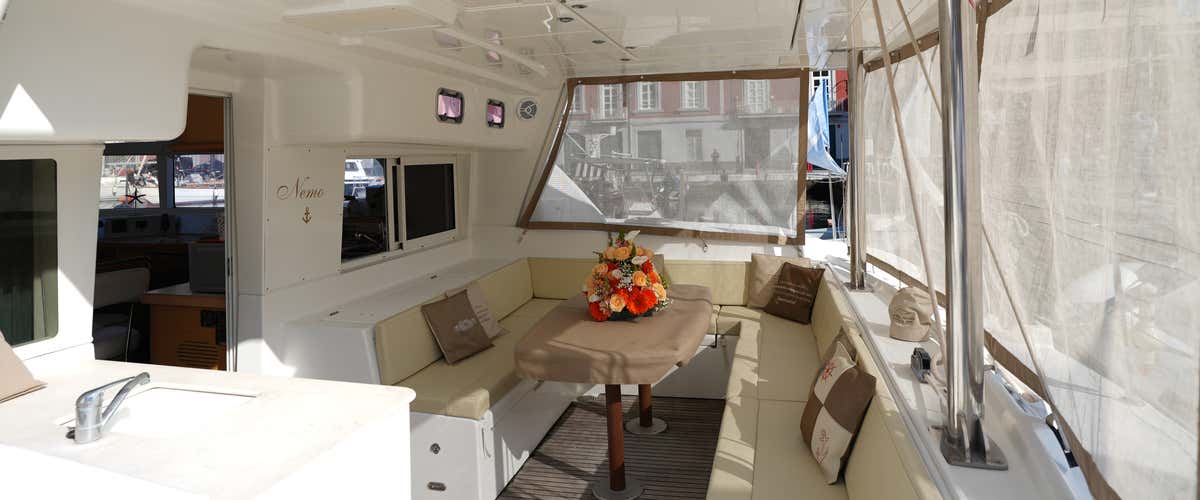 L'imbarcazione è un catamarano Lagoon 440 dotato due scafi ideali per chi soffre il mare, 4 cabine, 4 bagni, cucina e sala da pranzo.