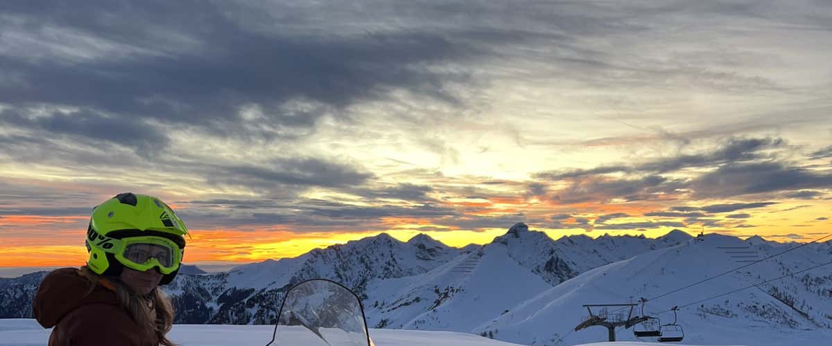 A Foppolo, nelle Alpi Orobie, ti metti il casco, accendi la motoslitta e segui la guida fino a 2200 metri, tra boschi innevati e curve che si accendono di arancio al tramonto.