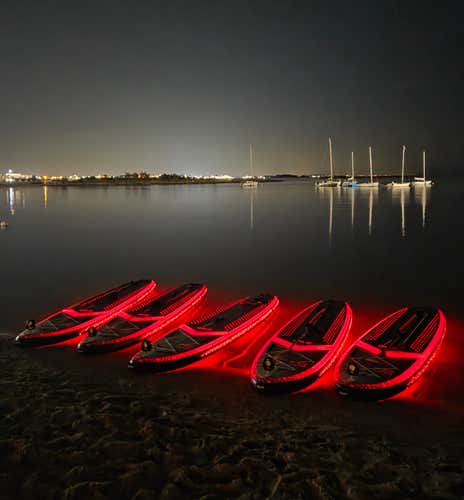 Pagaiando al buio, saremo accompagnati dai riflessi dei nostri SUP dotati di luci a led, che coloreranno il mare di toni suggestivi.
