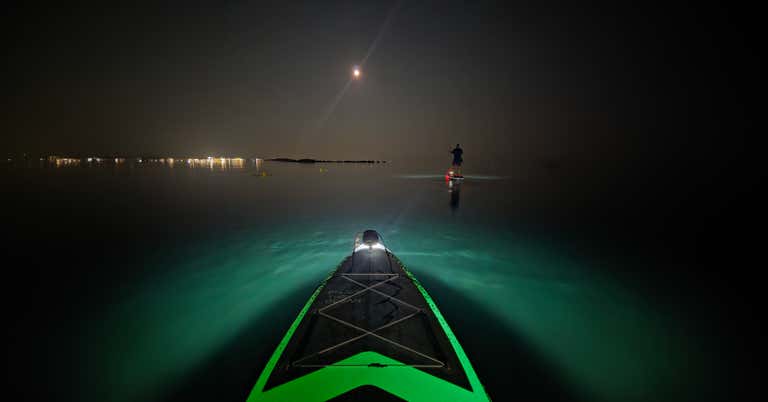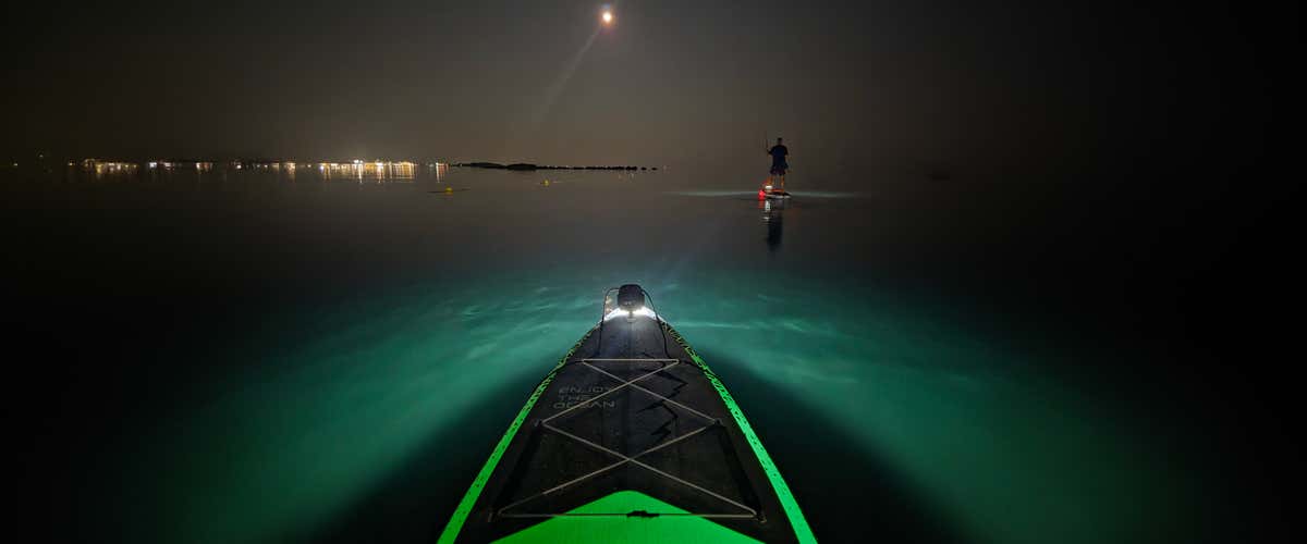 Vuoi vedere una magia? Vieni in SUP a Porto Cesareo di notte e guarda il mare accendersi di colori sotto la tua tavola!