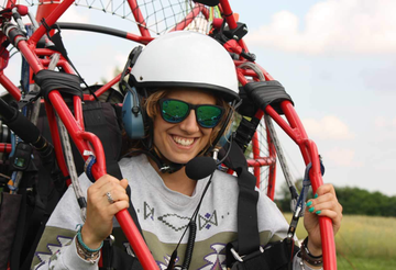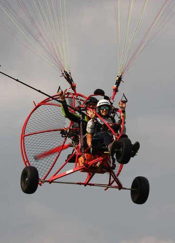 Dopo un breve briefing con il pilota, sarà tutto pronto per partire. Ti accomoderai su una selletta confortevole, con la grande vela che si apre sopra di te e il motore che inizia a spingerti in alto dolcemente.