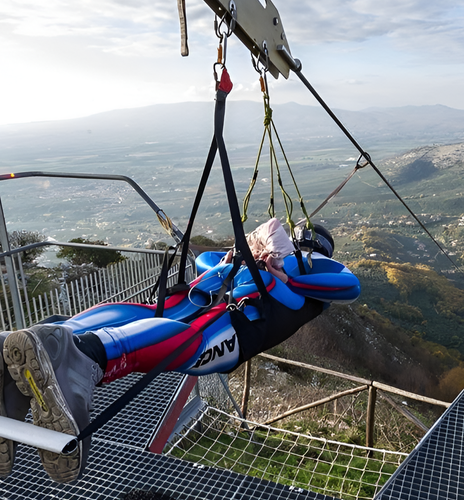 Volerai sulla zipline come un falco pellegrino, rapace molto diffuso sui Monti Lepini, lasciandoti scorrere su un cavo d'acciaio lungo oltre 2 km. Partirai dalla rampa di lancio a 730 m per raggiungere la rampa di arrivo a quota 380 m: 2 minuti di volo con picchi di velocità fino a 172 km/h!